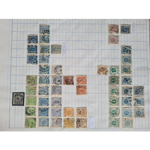 Collection of many 100s early to modern mint & used stamps on large old time ledger pages unpicked with good range of different issues including 1856 Local Stockholm 1sk grey-black on thick paper (trace thin, cat £500), 1858-72 nice range of duplicated values with cds postmarks 5o green (5), 12o blue (20 incl many shades), 24o orange (2), 1864-72 3o brown (2), 1872-79 3o brown (10), 4o grey (9), 5o green (shades, 9), 6o lilac (7), 12o blue (36, one with line flaw Facit rated Skr2000), 20o vermilion (5), 24o yellow (4), 30o brown (12), 50o red, Official 1874 to 1k (4), P. Dues different perfs to 1kr (5), then 100s of defins and commems 1920s onwards etc. Ideal to fill those gaps. Many, many 100s.