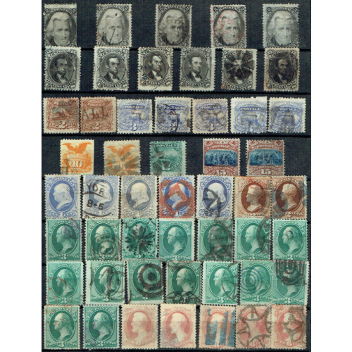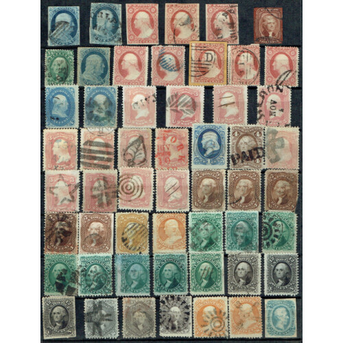 1851-66 Selection on stockpage of 54 stamps 1c to 30c, duplicated unidentified including 1851-57 Imperf 1c blue (2), 3c dull red (3), 1857-61 1c blue, 3c dull red (5), 1861-66 1c (2), 3c dull red (13) including a few fancy cancels incl a leaf, star, cross, red New York CDS, 5c brown (5), 5c olive-yellow (faults, Scott $4750), 10c green (8), 12c black (3), 24c lilac (3, faults), 30c orange (3), attractive assembly with high Scott retail, mixed but many useful pickings. (54).