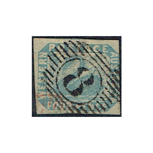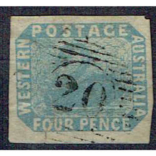 Western Australia: 1854 4d pale blue fine used with three large margins, fourth just touching on the right side, crisp 8 numeral cancel of Fremantle, superb. SG 3.