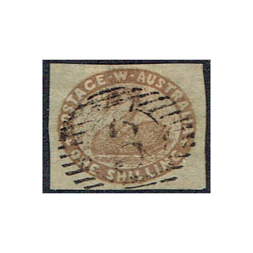 Western Australia: 1855 1s pale brown fine used with four large margins, neatly cut square, crisp 3 numeral cancel of Perth, superb. SG 4c.