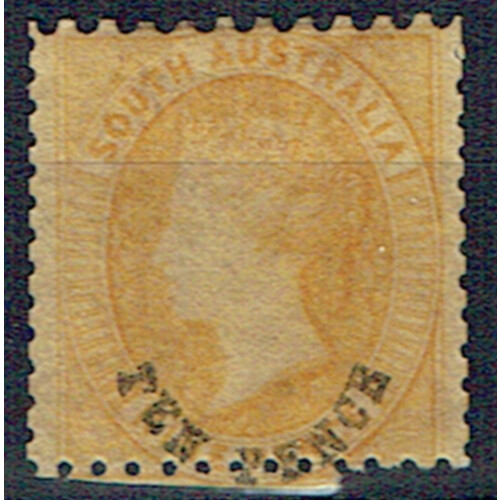 South Australia: 1870 10d on 9d yellow mounted mint part original gum, perforation have cut unevenly into the stamp leaving a square stamp rather than normal, Still cat £350, SG 107.