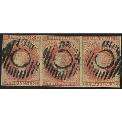 South Australia: 1856 2d red in an attractive strip of three close margins in places each with O round barred cancel in black. Fine. SG 9.