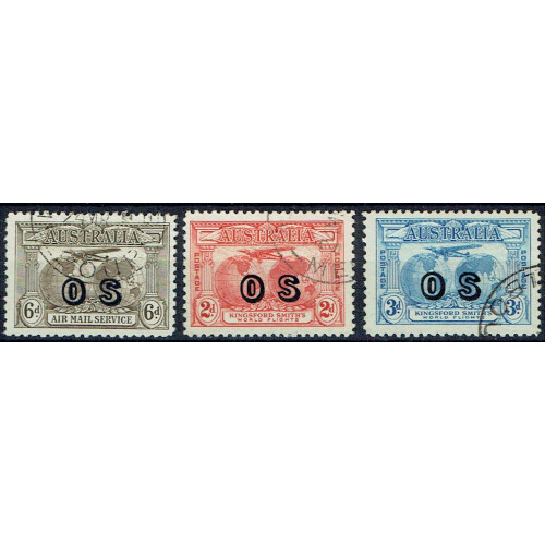 OS Overprints on Fokker 2d & 3d, plus 1931 6d air all cds used, SG 139a, O123/4.