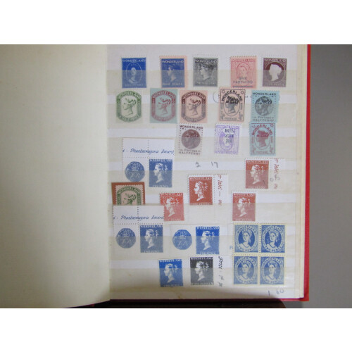Gerald King: Wonderland confections made with Queen Victoria designs from different countries for 50+ singles taken from designs incl Antigua, Tasmania, Grenada, Chalon heads, Gambia types, plus 10 pairs, and 10 blocks of 4, 5 strips of 3, and includes a few GB QV designs incl Penny Black etc. Interesting group. (c130).