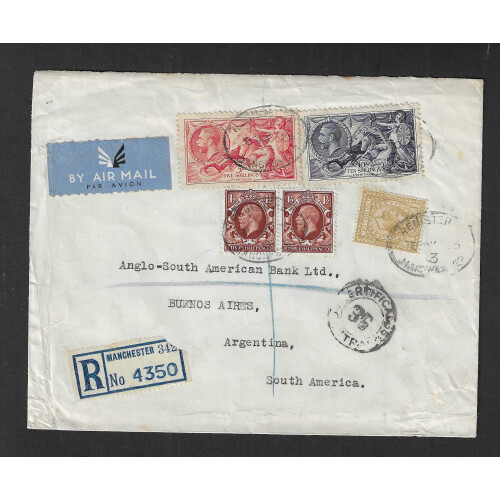 1935 Registered airmail letter Manchester to Anglo-South American Bank Ltd, Buenos Aires, Argentina bearing 1s bistre (SG 429), 5s carmine (SG 451) 10s indigo (SG 452), and pair of 1½d (SG 441) each cancelled by Manchester registered ovals for 8th Nov. 1935. Backstamped upon arrival in Buenos Aires, attractive franking.