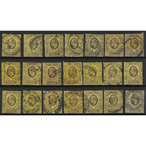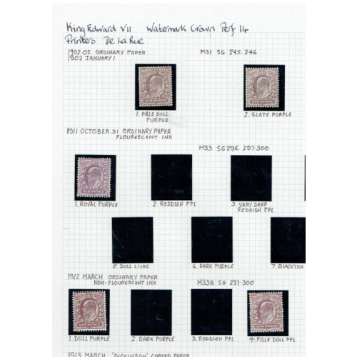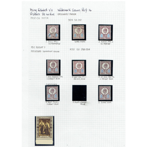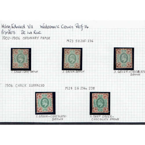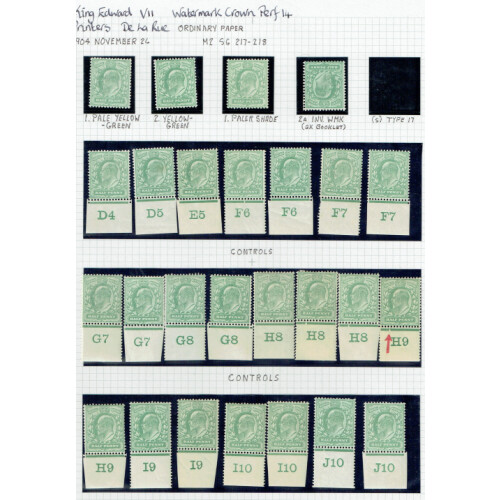 1904 ½d yellow-green album page of control singles mint including D4-5, E5, plus both perf & imperf margins for F6, F7, G7, G8, H8, H9, I9, I10, J10. A few with frame breaks. (28). Plus some single shades mint and wmk inv variety.