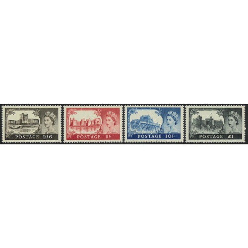 1955 Waterlow Castles set of 4 to £1 hinged mint with hinge remains, fresh, SG 536/9 Cat £250.