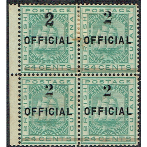1881 2 on 24c emerald-green OFFICIAL left marginal mint block of four showing type 24 surcharge (R8/1) and three other stamps showing type 23 surcharge. Top two stamps showing the two different types setenant heavily mounted mint with rust spots coming through from the gum side additional gum bend. A scarce a positional block showing both varieties setenant, SG 157a & 156 x 2. Very rare.