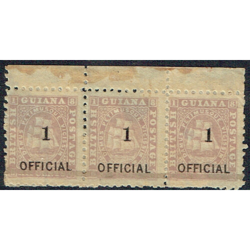 1881 2 on 12c pale violet OFFICIAL single (SG 155) affixed along with a strip of three type 24 surcharge 2c on 12c pale violet (SG 156 x 3), all on paper tied by fine used strikes of Georgetown squared circles. Attractive combination with very high value. SG 155/6.