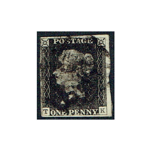 1840 1d black (TK) plate 1b with good three margins and black MX, touching along left side. Sound.