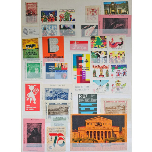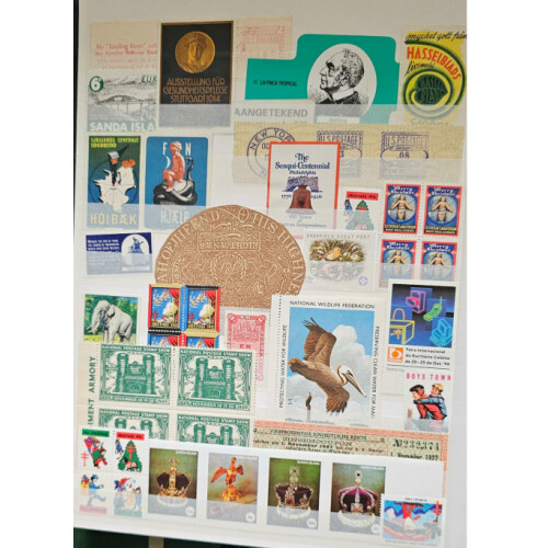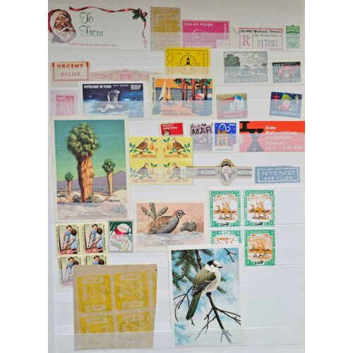 Stockbook (16 sided) with a good range of mainly all different poster stamps, advertising labels perf, imperf mainly mint, USA 1936 Stamp Exhib., FREE KUWAIT corner marginal label in black, India states court Fee revenues, 1854 4a reproduction in blks of 4, GB Machins with P.O. Training bars in blks of 4, lots of different countries mainly from 1897 to modern. Approx 500+.