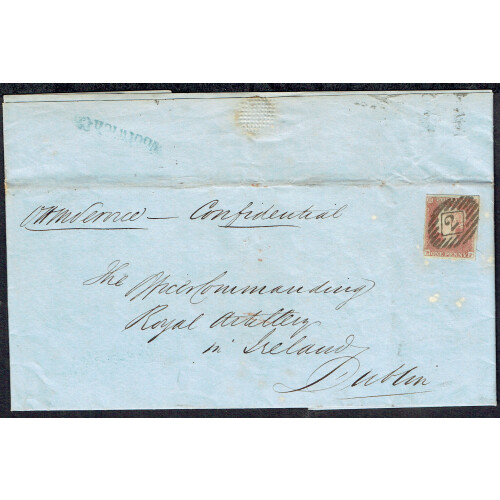 1850 A large letter sent to the Officer Commanding, Royal Artillery in Ireland, being handwritten copy of several letters advising the Commanding officers to dissuade the soldier's from buying Loan Bills that are worthless and soldier's applying for debtors relief under the act, with persuading officers under their command from pursuing the ruinous practices issued by the Ajutant General's office Woolwich, also copied to House Guards, To remedy the disgraceful position of officers as to Bill transactions......organized number of persons or gang who wait on the officers in the barracks to tempt them and obtain bills and pass them to one to another. Bearing 1841 1d red cancelled '2' numeral cancel and blue Woolwich h/s. Interesting insight.