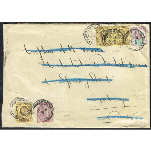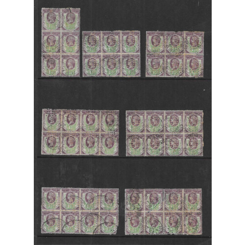1887 1½d dull purple and green a small group of perfinned blocks of 8 (9), blocks of 6 (4), blocks of 4 (3), mixed condition mostly on original paper with a variety of cancels, perfins are fancy AI s. (108 stamps). Cat £1900+.