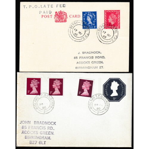 1960-1980 Group QEII Postal Stationery covers & cards all diff + plain covers & card cancel almost all diff TPO pmks. Couple with TPO late fee paid or posted without late fee 1d to pay. With TPO's Derby-Bristol Midland TPO.G G North, Birmingham-Crewe TPO, Norwich-London, Up special types etc. Mostly good condition. 8 items.