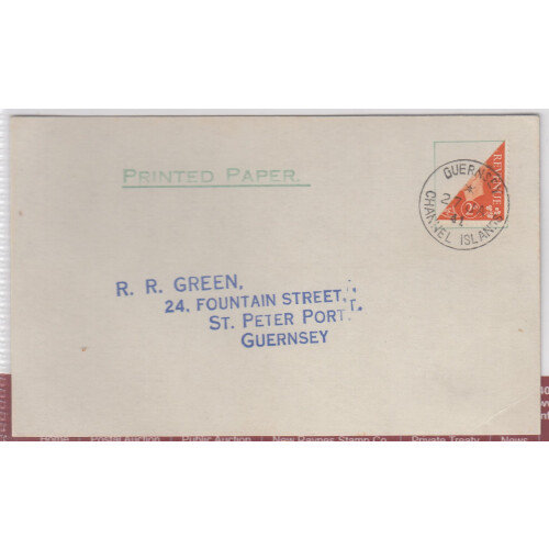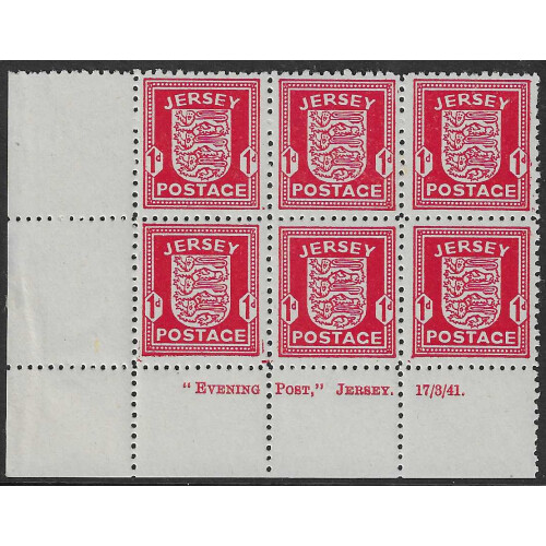 1941-42 Two bottom left corner imprint blocks of 6 ½d bright green Evening Post Jersey January 1942 and 1d scarlet Evening Post Jersey 17/3/41, both mainly unmounted mint, fine for these, nice positional pieces. SG 1/2.