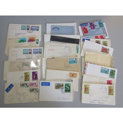 1960s Registered multi franked registered philatelic & commercial covers to USA or UK sent for their different town postmarks, noted Fanning Is., Tarawa, Arorae, Nanumanga, Abaokoro, Abiang, Bairiki, Aranuka, Auckland Packet Boat, Nanumea, Nonouti, Funafuti, Vaitupu, Onotoa, Makin, Abemama, Marakei, plus many more. (60+).