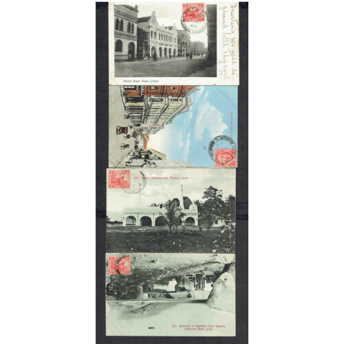 Federated Malayan States: 1906-12 PPCs mainly with stamps used on obverse tied KUALA LUMPUR, SEREMBAN, SINGAPORE. All with FMS Tiger defins incl 1c green strip of 3, 3c rate to Switzerland, (7). Minor faults.