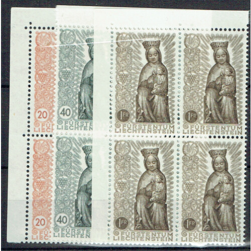 1954 Termination of Marian Year set of three in top left corner marginal blocks of 4 unmounted mint, SG 327/9. Cat £330.