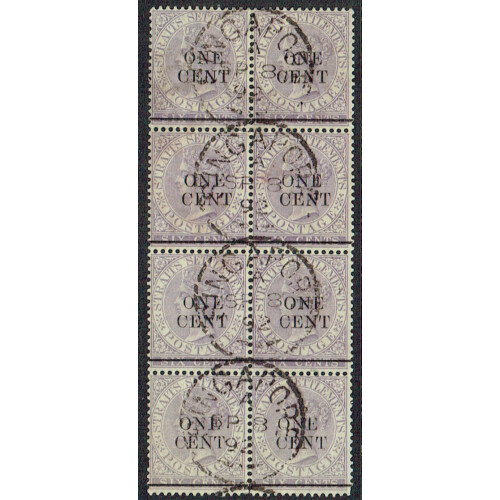 Straits Sett.: 1892 1c on 6c lilac in a fine used block of eight, some split perfs, attractive block SG 90.