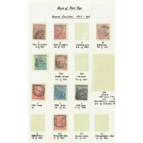POSTMARKS Collection on leaves on Sitting Hope issues from different printings each selected for postmark interest incl small barred triangles on 1d strip of 3 (2), duplex numerals (c33), cross pmk, cds cancels (c90) incl a part RORKES DRIFT cds in 1903, Mafeking single cds, Parcels cds and dumb cancels some in blocks of 4 or 6, a few telegraphs cds, 1904 2d brown in a large block of 15 plus strip of 3 with Graaf Reinet cds's, etc, intr lot.