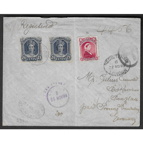Newfoundland: 1899 (31 Oct) Registered cover (folded vertically) St John's to Germany with attractive combination 1865 24c blue QV two singles (SG 30 cat £800 on cover) 1870 6c rose (SG 39, cat £256 on cvr), ST JOHN'S CDS cancels, R oval, London registered hooded cancel in violet, and London oval transits. Impressive cover.
