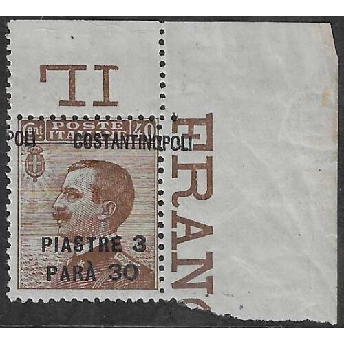 Post Offices in the Turkish Empire: Constantinople: 1923 3pi.30 on 40c brown an amazing top right corner marginal imprint single unmounted mint showing dramatic misplacement of CONSTANTINOPOLI across into the margin showing the surcharge and overprint were applied differently. SG 192 var. Unique.