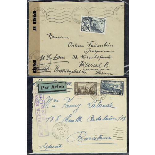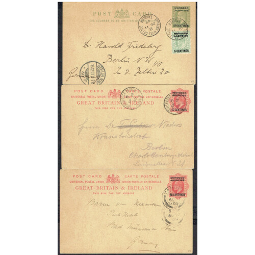 Overprints on GB & few Gibraltar EDVII postal stationery cards, wrappers and envelope including wrapper 5c on ½d green unused (2), 10c on 1d red unused (4), postal cards 5c on ½d, 10c on 1d unused, 1906 30c on 1½d brown registered envelope unused, 40pa on 2½d brown registered envelope unused (H & G 14a), 1906 20c on 2d red used to Berlin. Nice group (11).