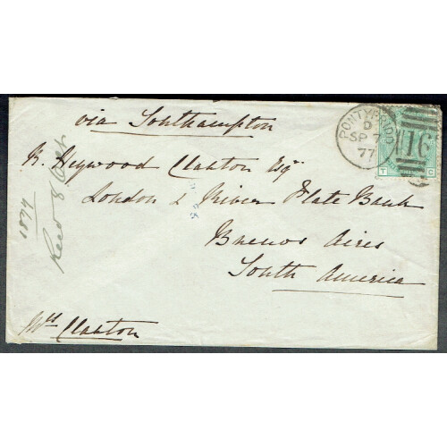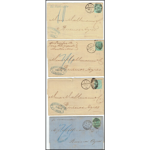 1874-75 Correspondence from London to Buenos Aires. Four covers each bearing 1s green plates 8, 9, 10, 11 tied London 96 duplex (2), London 87 duplex, and Liverpool 466 duplex. Being a business correspondence Brandt & Sons some with manuscript of h/s Via Southampton, or per Pacific Steamer via Liverpool / Montevideo, small faults and Liverpool is toned other cat £960+ on cover. Nice original lot.