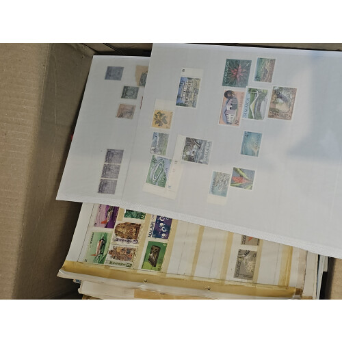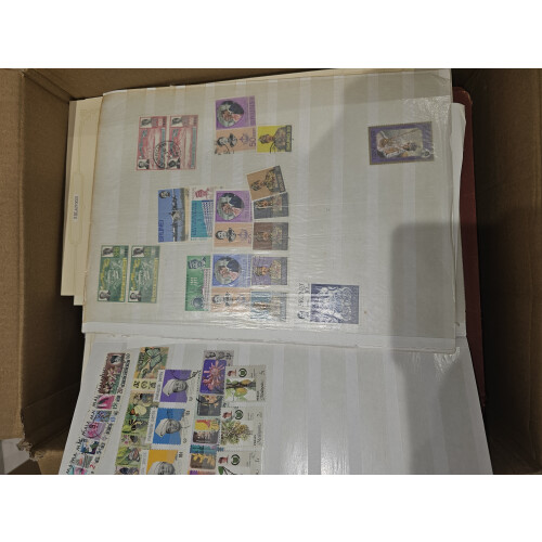 BOX containing a worldwide accumulation from a huge estate lot unsorted and unpicked as received (a van full) typically includes albums, folders, on leaves, stockbooks, noted USA 19th century plus some nice revenues $2+, Italy folder from 19th century to modern, Japan, Italian colonies, too much to list, a good genuine sorter lot offered intact, plenty to go at here, 1000s?