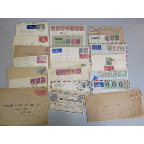 Group of covers from GV/QEII includes nice multi franked covers, noted 1958 UMUTO, UGUUOBA, ABA, DEGEMA, 1954 OHMS EBUTE METTA (Chief Railway Engineer), 1948 1s postal order ABATETE (toned), 1949 KANO, BAMENDA, ASABA, OBUNDU, AKURE, EHOR, YABA, etc. Very mixed but useful group of 22 covers.