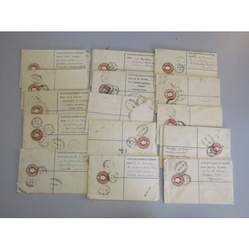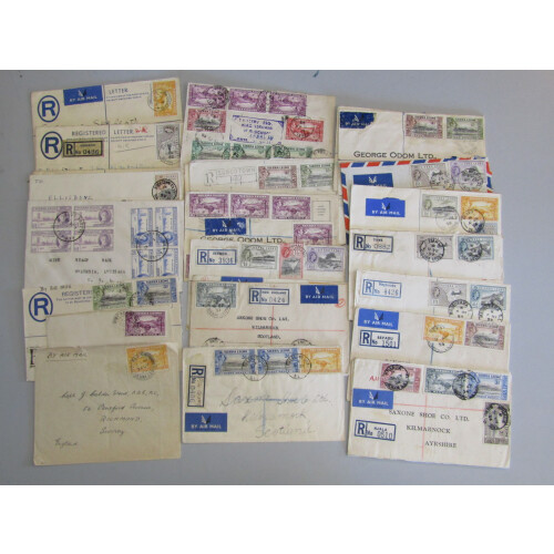 1950s original registered correspondence from different towns in Sierra Leone mainly to Shoe Manufacturers in Scotland, mostly on QEII 4d orange-brown registered envelopes, mostly uprated with QEII defins on obverse, some uprated with GVI defins, towns include MATTAU, MUNGHERI, HANGHA, SULIMA, ROTIFUNK, NJALA, KASSERI, LUNGI AIRPORT, HUIOU TOWN, BRADFORD, SEGBWEMA, PORT LOKO, KOIDU TOWN, GBANGBATOKE, FREETOWN BO TPO, SEMBEHUN, MAKENI TPO, then 6d orange-brown incl KAMAKWIE, GBINTI, PANGUMA, KENEMA, etc, very mixed (26).