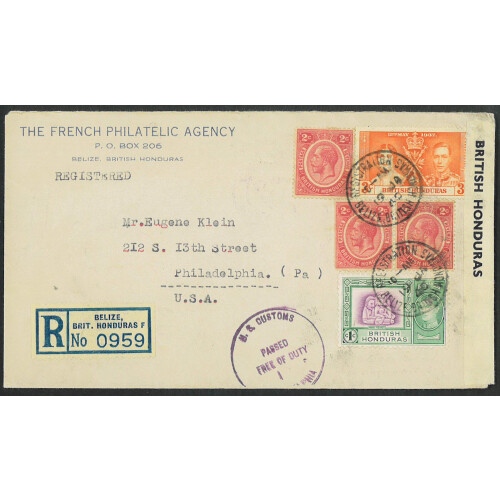 1940 (19 Jan) Censored regd cover to USA bearing multi franked GV 2c x 3, GVI 1c & 3c tied REGISTRATION BELIZE / BRITISH HONDURAS. With OPENED BY / CENSOR / BRITISH HONDURAS censor label at left. Little type CL1.