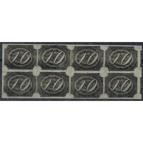 1844-46 10r black in a fine block of eight on greyish paper unused no gum, very neatly cut with margins all round (showing next two stamps on right), lovely album piece, taken 'as is'. Scott 7. Scott $1,000.