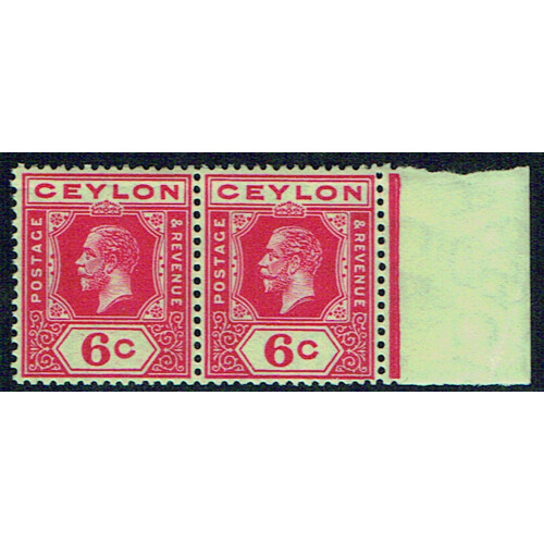 1919 6c pale scarlet in a right marginal PAIR unmounted mint showing watermark sideways variety. Fine, SG 305a.