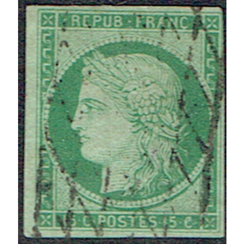 1849: 15c Green/Bluish green four margins (just touching at NE) otherwise nice stamp, grille sans fin cancel yvert (2) SG(4).