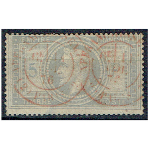 1869 : 5f used Laureated double 1876 red cancel & superb appearance, but has a small thin at the bottom just of centre and other thin spots. SG (131).