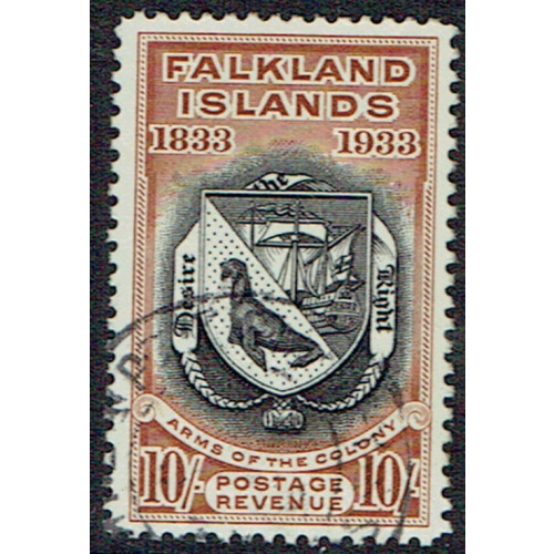 1933 Centenary 10s black and chestnut fine used neat double ring cds incomplete PORT STANLEY, very fine, SG 137.