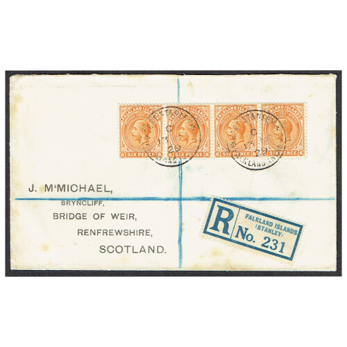 1929 (13 Nov) Registered J M'MICHAEL cover (light aging spots) to Scotland bearing GV 6d yellow-orange in a superb strip of four tied PORT STANLEY / C d/r cds cancels, neat regd etiquette of FALKLAND ISLANDS (STANLEY) No. 231. Attractive album piece, SG 78.