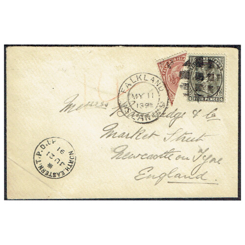 1891 (11 May) Fifth Mail Cover to Newcastle On Tyne, UK carried on the Karnak. Bearing ½d surcharge on half 1d red-brown tied along with 4d olive grey-black tied with 'First Bisect' cork cancel (Barnes 1/90) correctly used in the period for the 4½d rate to UK and tied alongside FALKLAND ISLANDS double ring cds and red pencil 14 along side (another provisional cover has black pencil 13 so this corroborates sequential records). NORTH EASTER T.P.O. UP transit cds on obv. Taken from an old album page pencilled Bought from SG in 1947 for £30. No other provenance. Taken 'as is'.