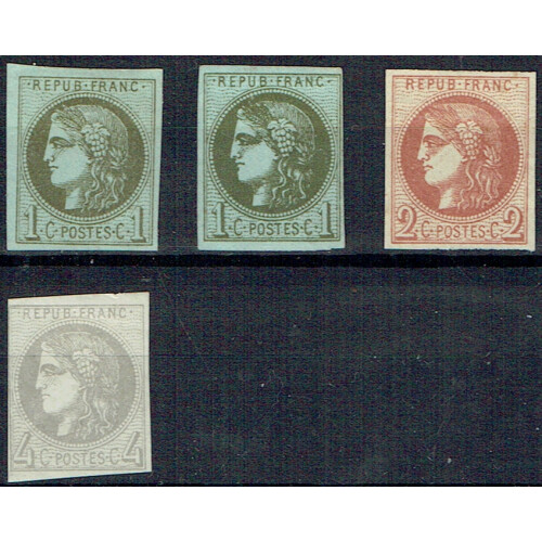 1870: Bordeaux issue stamps (4) in this lot 2x 1c, 2c, and 4c presented on stock card unused with (no gum), no thins and with decent cat value. nice clean stamps