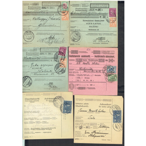 Parcel and receipt forms used with Lion adhs tied various cds cancels in the 1920s to 1931, some nice combinations to 5m face value, approx. 45 examples.