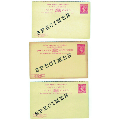 SPECIMEN Overprints on eight Queen Victoria reply card, registered P/S env. Includes QV 1d red Reply card, 1d red single card, 1½d grey with very small SPECIMEN in black (rare type), EDVII 1d single card, 2d blue registered env., GV 1d red reply card, 1d red single card & 1½d blue registered env. each with SPECIMEN diagonally across the centre in black on both sides. Nice group of 8 Specimen items.