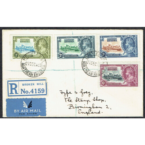 1935 (27 Dec) Regd cvr to UK bearing set of four Silver Jubilee tied BROKEN HILL cds cancels.