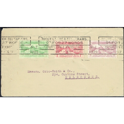 1925 Dunedin Exhibition set of three on typed First Day Cover cancelled roller type NIGHT LETTER TELEGRAMS / 9D FOR 27 WORDS / DUNEDIN EXHIBITION / NO 17 1925. Mostly fine and unusual cancel for these. SG 463/5.