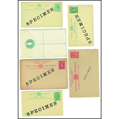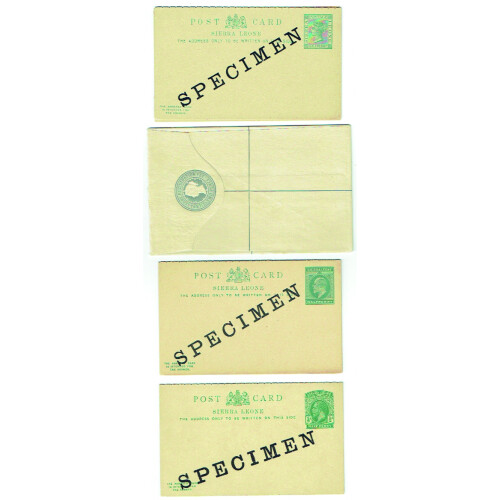 SPECIMEN Overprints on four Queen Victoria, two EDVII, four GV postal stationery cards and registered envelopes. Includes QV ½d green reply paid card printed Specimen diagonally on both parts, ½d green single card, ½d green newspaper wrapper, 2d grey Registered envelope, EDVII ½d green card, ½d green reply card, George Fifth ½d green reply card, ½d green single card, 1½d red single card, ½d green newspaper wrapper each with SPECIMEN diagonally across the centre in black. Nice group of 11 Specimen items.