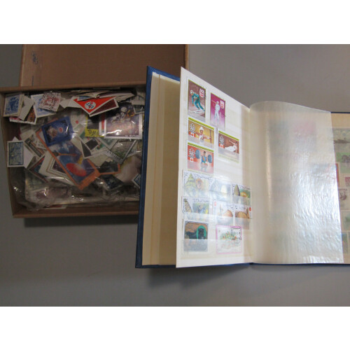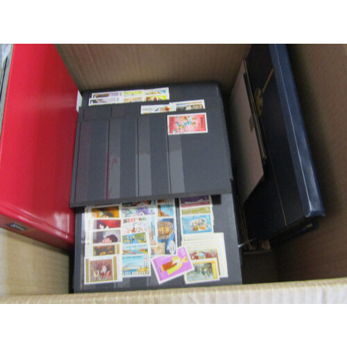 Accumulation in smaller box of stockbooks, loose, stockcards mainly commoner thematics, wall paper types but odd better, lots of different countries, 1000s.