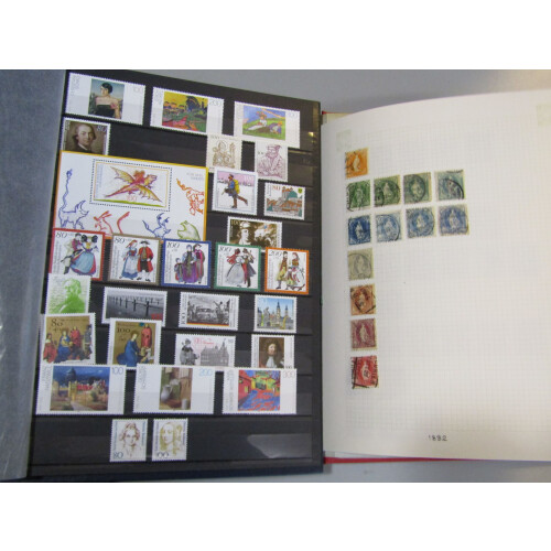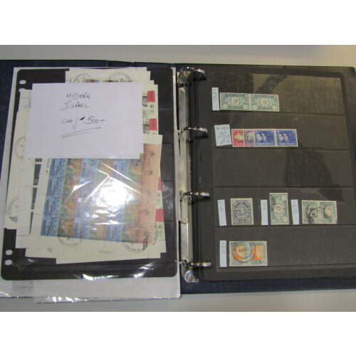 Various collections in a carton including Modern Germany umm in s/b inc. miniature sheets, Switzerland used collection in album,Spain used in s/b, Ethiopia used in small s/b, Indonesia, binder of used South Africa, Modern Israel sheets used STC £500, binder of GB receipts & WWI covers & cards inc censored, binder with collection of Serbia plus others.