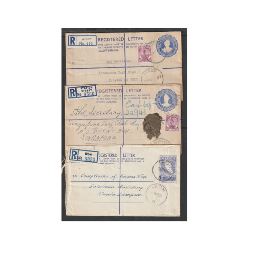 1957-1961 Registered mail mainly all different including postal stationery envs from Malaya Federation IPOH, ALO STAR, 10c brown MENTAKAB (faults), Johore 20c dark blue from JOHORE BAHRU, KUKUP, STATION STREET Kuala Lumpur, 1961 20c used from KANDANG KERBAU. Very mixed (8).
