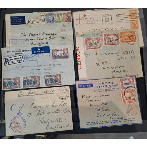 Balance of a WW2 censored mail estate including 1944 USA APO 930 with N.Z. E.F FIELD POST OFFICE on Patriotic Fund env of N.Z., KUT air letter to IOM with KUT GVI (one torn) tied blank d/r cds from FMO KILINDINI, 1943 FPO 108 stated as Gold Coast, Aden PASSED CENSOR NO.3 (poor), 1944 Ceylon regd air mail from Norwegian Consulate in Colombo (official mail was not censored), 1942 Australia PASSED CENSOR 2674 boxed h/s, 1940 PASSED BY CENSOR NO.8 (faults), c15 items.