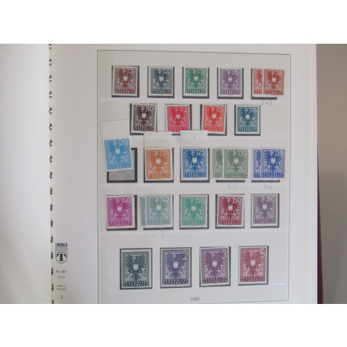 1945-1974 An attractive unmounted mint collection in a Lindner hingeless printed Album partly complete with better noted including 1948 Creative Artists set (Cat £55), 1948 Costumes incl 1s red (Cat £130), 10s grey (Cat £50), 1949 Child Welfare set (Cat £80), 1949 POW Fund set (Cat £49), 1950 Carinthian set 3 (Cat £140), 1950 Air Birds set minus 20s incl 3s & 5s key values (Cat £500), 1951 Reconstruction Fund set (Cat £80), ideal for expansion, approx 960 different. High cat value.
